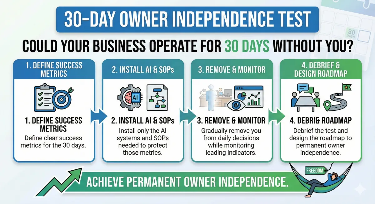 We run a structured, low-risk experiment: we design AI and process scaffolding so your business can operate with minimal owner involvement for 30 days, then measure the results.