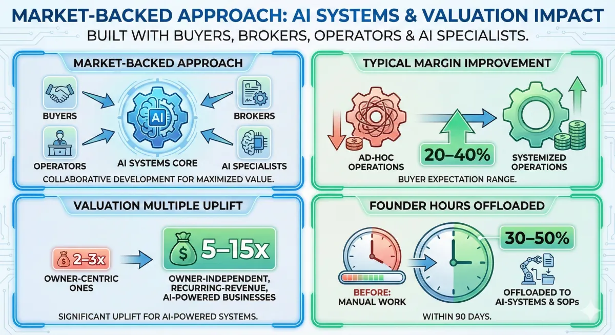 Without AI: founder-owned knowledge. With AI: documented playbooks and SOPs; business operates 30+ days without founder — +2–3x multiple impact.