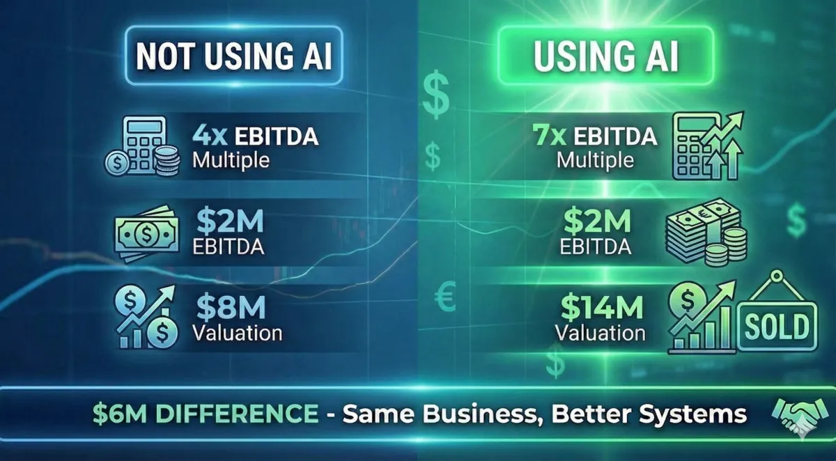 A: That's exactly why AI creates such dramatic value for you. We don't need perfect data—AI works with messy, imperfect inputs. In fact, businesses with manual, founder-dependent processes see the BIGGEST valuation uplifts because the "before/after" contrast is so compelling to buyers.